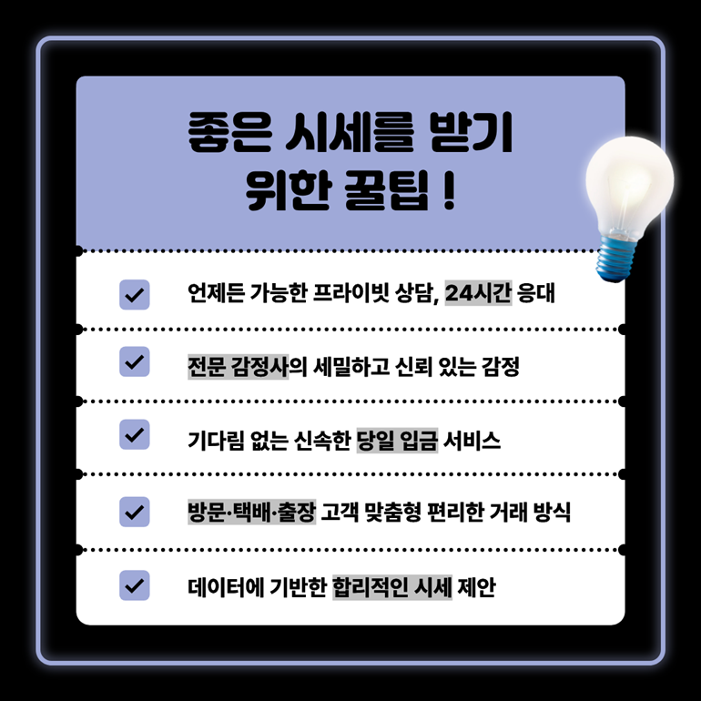 또한 박스나 보증서 등 구성품의 유무가 가격에 영향을 미치므로 가능한 모든 구성품을 함께 준비하는 것이 좋습니다. 정품 여부에 대한 전문가의 감정이 반드시 필요하며 한 곳의 견적에 만족하지 말고 여러 곳의 견적을 비교해보는 것이 현명합니다.
