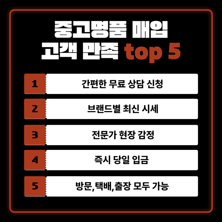 A: 보증서와 더스트백은 가장 중요한 구성품입니다. 오리지널 박스와 영수증도 있다면 더 좋은 조건으로 오산중고명품매입이 가능해요. 구성품이 완벽할수록 높은 가격을 받을 수 있습니다.