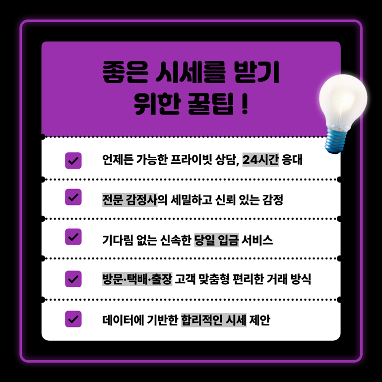 A: 대부분의 전문 매입업체는 무료로 감정 서비스를 제공합니다. 단 택배로 보낼 경우 왕복 배송비가 발생할 수 있어요.