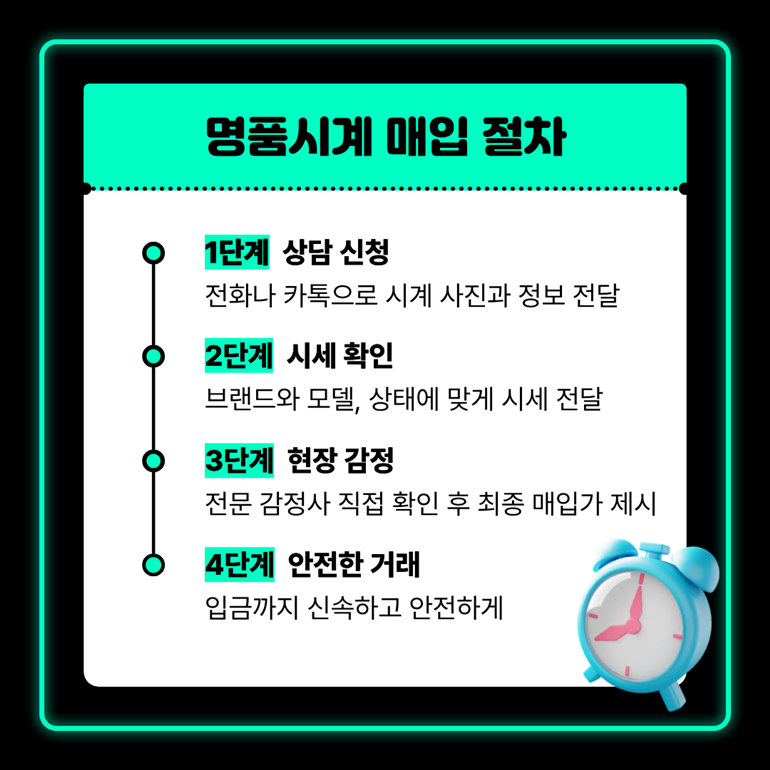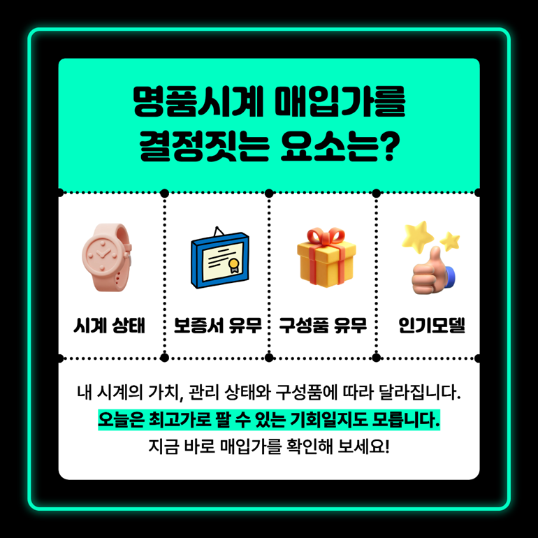 명품시계를 판매할 때는 몇 가지 주의사항이 있습니다. 시계 시세는 계속 변동하므로 판매 타이밍을 놓치면 가격이 더 떨어질 수 있습니다. 빠른 현금화가 필요하다면 전문가에게 의뢰하는 것이 안전하고 정확한 방법입니다. 전국 출장 매입 서비스, 택배, 방문 등 다양한 거래 방식이 있으니 자신의 상황에 맞는 방법을 선택하세요. 혼자서 시세를 파악하기는 어렵고 개인 거래는 위험 요소가 많습니다. 구성품이나 시계 상태에 따라 매입가가 달라질 수 있으므로 주의가 필요합니다. 반드시 여러 곳에서 비교 견적을 받아보고 가장 유리한 방법을 찾아야 합니다. 대부분의 전문 딜러는 무료 견적 서비스와 빠른 응답을 제공하니 부담 없이 문의해보세요. 지금 바로 견적을 받아보시면 현재 시세를 정확히 알 수 있습니다.